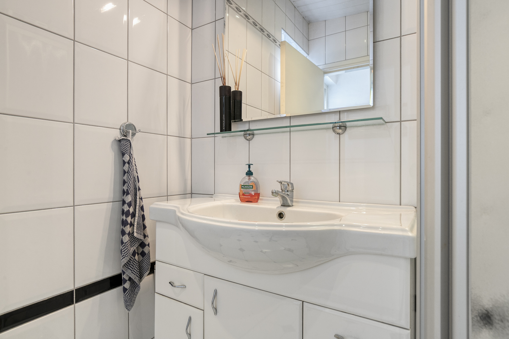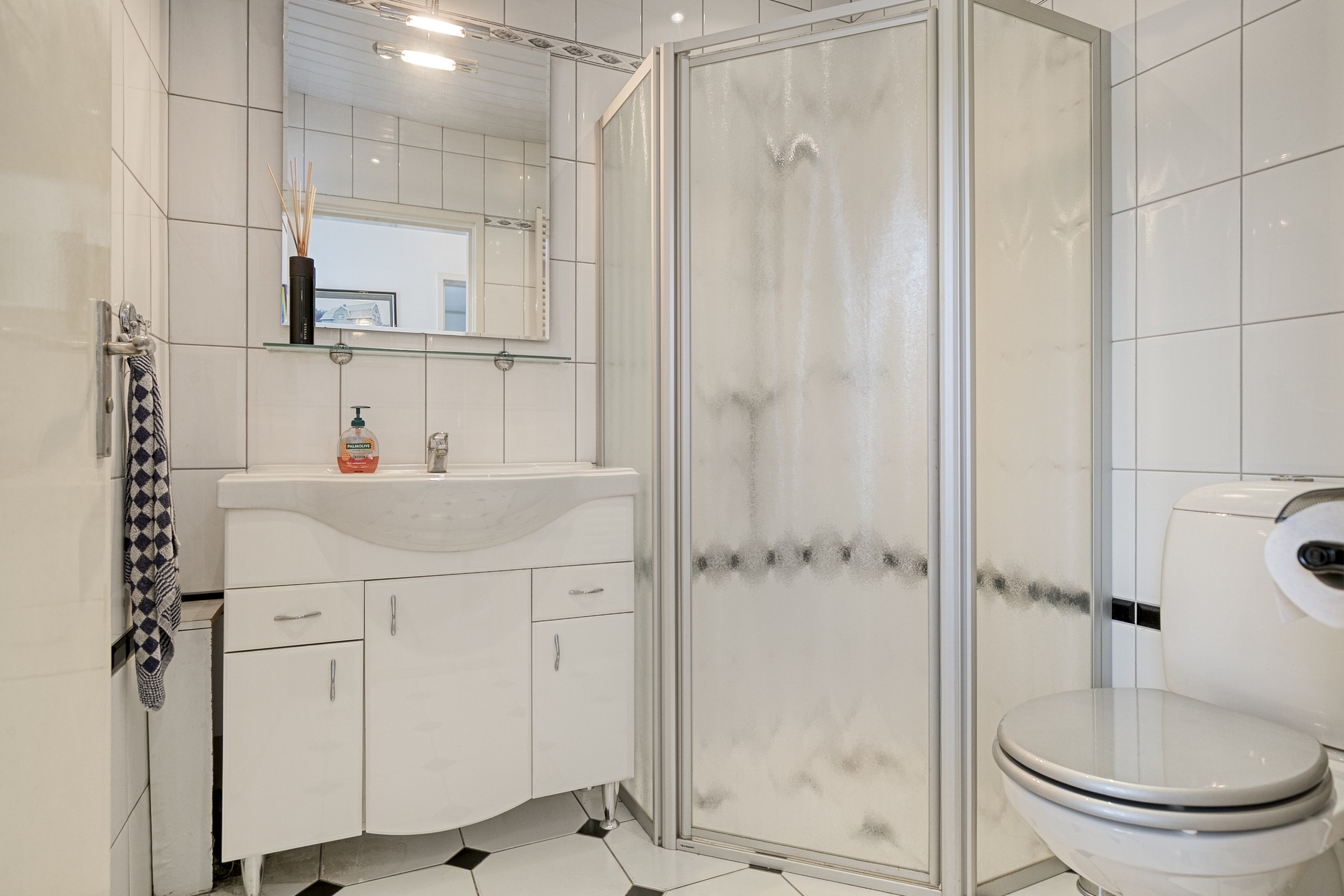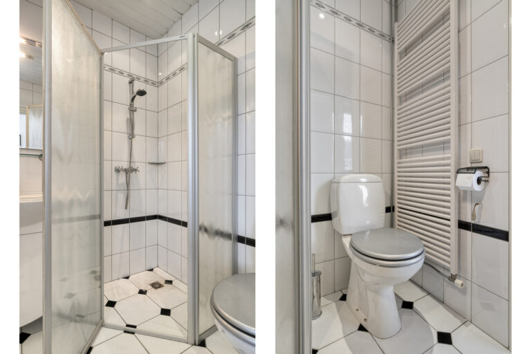 De badkamer is volledig betegeld en voorzien van een toilet, douche en wastafelmeubel.